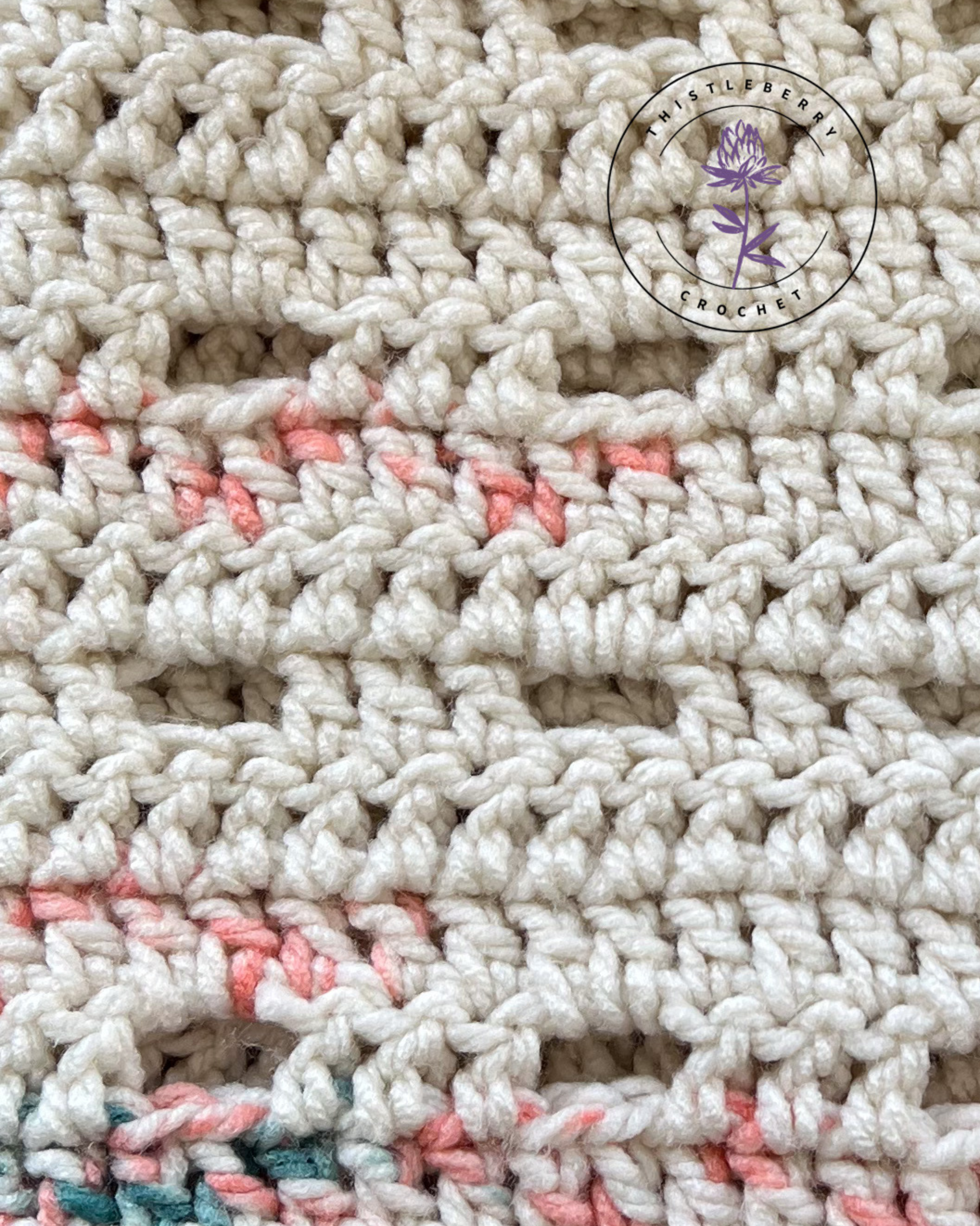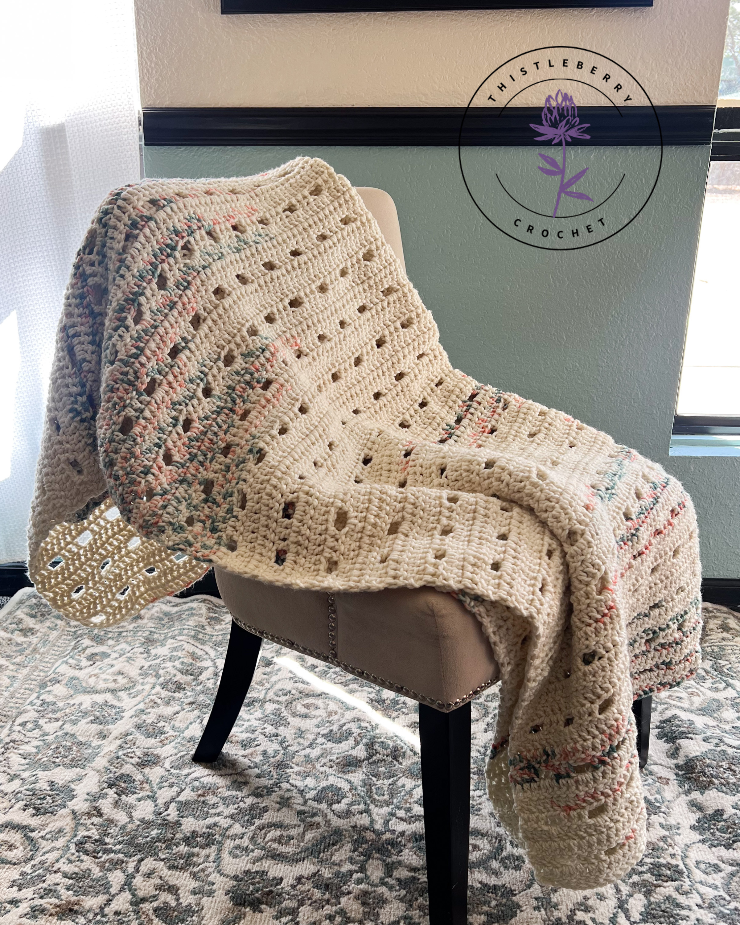 At 55” x 70” this throw is a great size for getting cozy, and it’s so easy to make! The little windows help this project work up quickly, and the three-row repeat pattern makes it a stress-free project (without being overly tedious).