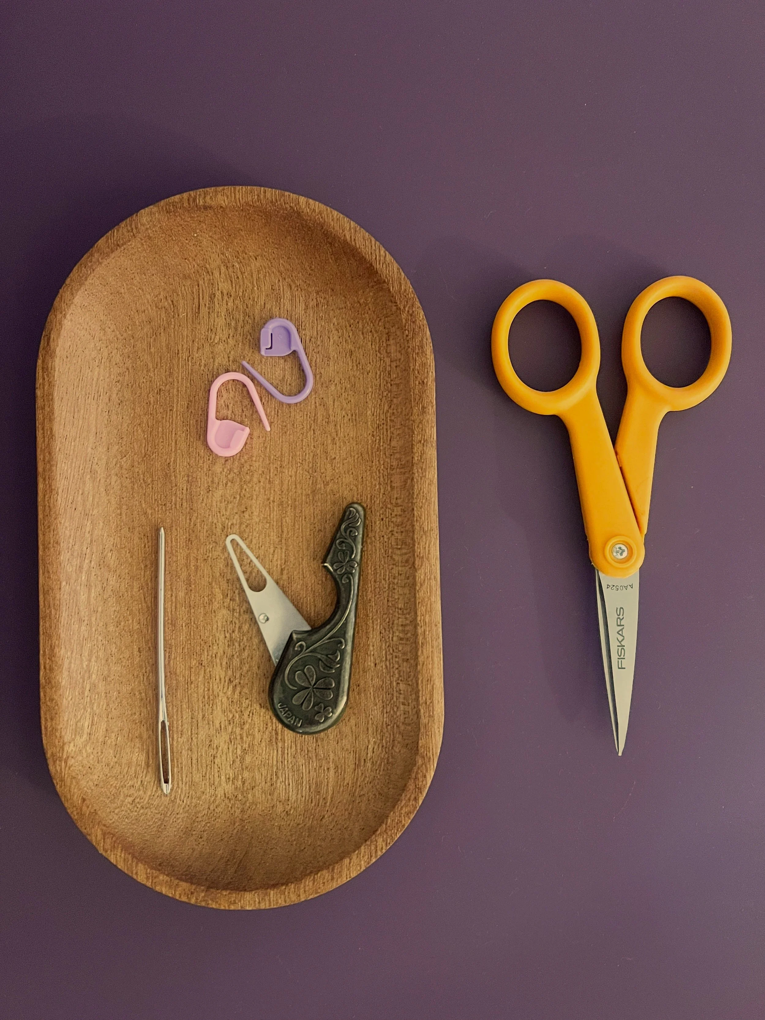 A yarn needle, needle threader, locking stitch markers and scissors are must-have supplies for me!